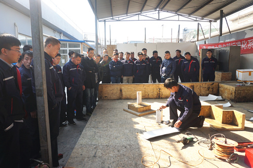 下午,《单程防水卷材屋面工程技术规程》及《TPO事业部施工流程梳理及材料管理》的宣贯,让与会人员明确掌握了工程技术及施工过程中的规章制度,项目经理组和工人代表组也就项目管理的经验与施工技术作了分享,新同事们如获至宝,现场提问、讨论同步进行。 颁奖环节,现场为TPO事业部优秀项目经理王海东、崔岩,优秀施工班组张广志,优秀施工员李冰,优秀新人钟鱼,优秀施工队长高明坤等人颁发奖励及证书。 本次培训还组织TPO细部节点实操大赛,由2015中国屋面防水大师徐龙潇现场演示阴阳角和管根的标准化施工实操及讲解。TPO事业部的所有施工管理人员及班组组长聚精会神观看,精益求精的施工工法引来阵阵惊叹。