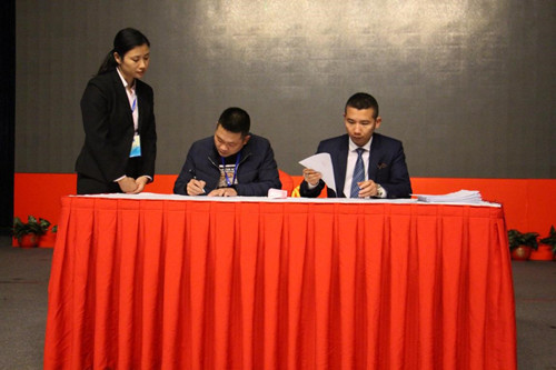 下午,长沙洛迪环保科技有限公司与各地新经销商正式进行签约仪式,各经销商们在主持人的提示下先后上台与洛迪总经理吴浩签订代理合同。