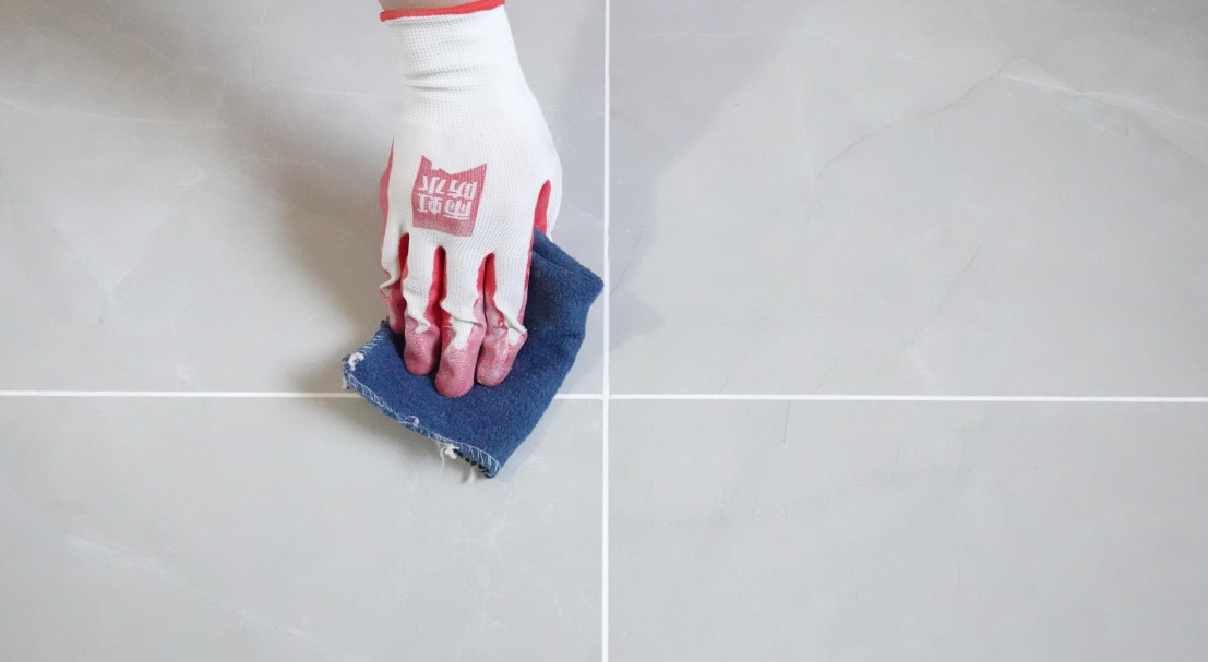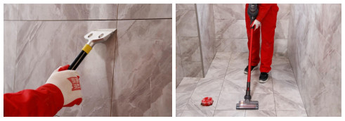 用吸尘器或毛刷清理粉尘:使用粉尘吸尘器将瓷砖缝隙内部的粉尘吸干净,瓷砖缝隙两侧2cm宽采用抹布擦洗干净,保证瓷砖缝隙内不潮湿,无粉尘、颗粒、油渍、疏松物等,同时清洁瓷砖表面污染物。如担心使用吸尘器清洁仍不够彻底,可继续采用毛刷清理吸尘器处理不到或难以处理的位置,保证所有的瓷砖缝隙干燥无粉尘。