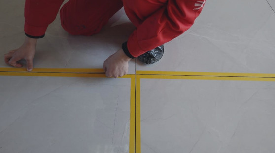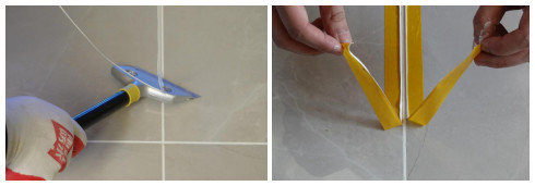 压缝处理(粘贴美纹纸):若需靓缝剂固化后瓷砖缝隙充分饱满成水平面,可采用美缝刮板或软胶板沿瓷砖缝隙均匀的用力从一端拉向另一端,且不偏离美纹纸,以防污染瓷砖表面。