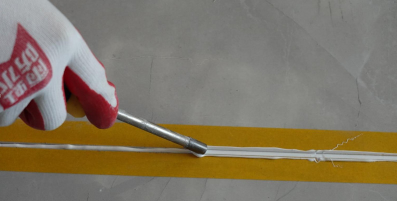 施工前去除前段20cm:挤压去除前段20cm的出料,使靓缝剂AB组分充分混合均匀,以防搅拌不均难以固化。