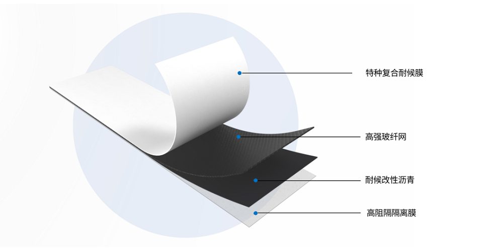 自主研发的复合耐候膜与耐候改性沥青,具有优异的耐候性和尺寸稳定性,可使卷材长期保持粘性。人工加速老化试验后,拉力强度可保持≧700N/50mm*。