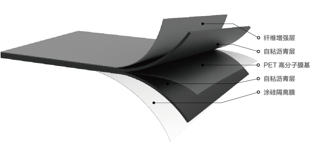 SAM-924纤维增强型高分子膜基自粘沥青防水卷材执行GB/T35467-2017《湿铺防水卷材》中的高分子膜基类。卷材以自粘沥青为粘接密封层,第一增强层采用增强纤维,第二增强层为高分子膜基,下表面覆隔离膜。
